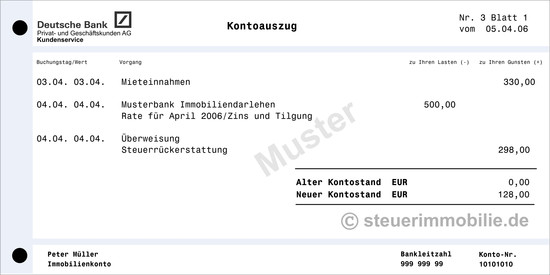 Dreh- und Angelpunkt einer Geldanlage ist immer der Zahlungsverkehr. Herr Müller eröffnete direkt nach dem Kauf ein Girokonto, auf dem sämtliche Einnahmen (Miete und Steuerersparnis) und Ausgaben (Zinsen und Tilgung) gebucht werden.
