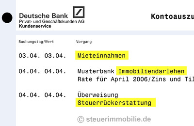 Jeden Monat fließen die Mieteinahmen der vermieteten Wohnung und die Steuerrückerstattungen (durch einen Freibetrag auf der Lohnsteuerkarte) auf das Konto von Herrn Müller. Zeitgleich werden von der finanzierenden Bank die Kosten für das Immobiliendarlehen - Zins und Tilgung - abgebucht (siehe nachfolgende Abbildung.).